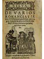 Silva de varios romances y letras, recopilada por cuadernos, con una gran suma de las obras de Don Carlos Boil, las más modernas que hasta hoy se han cantado. Véndese en casa de Joan Baptista Timoneda, junto a la Merced. [A la vuelta:] Primer cuaderno de la Silva de varios romances, los más modernos que hasta hoy se han cantado. [Índice:] 1. La costumbre de mis males. 2. Segunda vez desterrado. 3. Di Zaida de qué me avisas. 4. Un soneto.