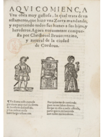Aquí comienza una obra muy gustosa, la cual trata de un testamento, que hizo una zorra mandando y repartiendo todos sus bienes a sus hijos y herederos. Agora nuevamente compuesta por Cristóbal Bravo, vecino y natural de la ciudad de Córdoba.