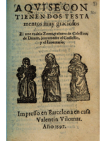 Aquí se contienen dos testamentos muy graciosos. El uno es de la zorra, y el otro de Celestina de Duarte, juntamente el Codicillo y el Inventario. Impreso en Barcelona en casa de Valentín Vilomar. Año 1597.