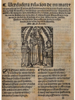 Verdadera relación de un martirio que dieron los turcos en Constantinopla a un devoto fraile de la orden de san Francisco, y de los trece que están en en el santo Sepulcro de nuestro Redemptor Jesucristo en Hierusalem, que venía a Italia su tierra, con un villancico de la obra. Compuesta por Diego López vecino de la ciudad de Córdoba. Con dos milagros de nuestra Señora del Rosario. Impresa con licencia en Valencia, junto al molino de Rovella. Año 1585.