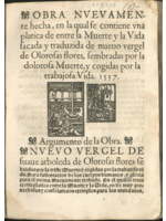 Obra nuevamente hecha en a cual se contiene una plática de entre la Muerte y la Vida, sacada y traducida del "Nuevo vergel de olorosas flores sembradas por la dolorosa Muerte y cogidas por la trabajosa Vida". Argumento de la obra. Nuevo vergel de suave arboleda de olorosas flores sembradas por la triste Muerte y cogidas por la trabajosa vida para sustentación de los cuerpos humanos y gloria para el ánima, nuevamente trovado, en el cual se trata cierta plática entre la Muerte y la Vida. Es de muy provechosos y consolatorios exemplos para los mundanos.